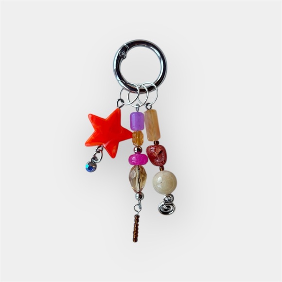 Vibrant keychain with star and bead charms. Features orange, purple, pink, and cream accents. Perfect accessory for bags or keys.
