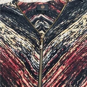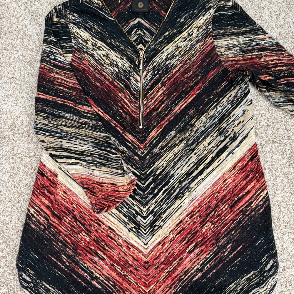 Stylish top with a chevron pattern. Features a mix of black, red, and cream colors. Perfect for casual wear. And sooo flattering, I’m tempted to keep it ! Always compliments and fabulous with gold jewelry