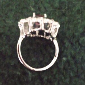 Stunning vintage sterling silver cocktail ring with many multi-color simulated stones. The halo cluster design begins with a large deep pink (almost red) oval stone in the center which is surrounded by brilliant accents of sapphire blue, light pink, emerald green, and sparkling clear stones giving this a burst of color. The stone section measure about 3/4"x 3/4" and there is a solid band. This is very pretty and sparkles nicely in the light - a true statement ring. (only wore it a few times; it doesn't fit anymore)