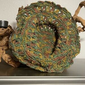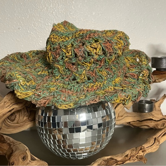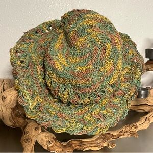 Stylish crochet hat with a mix of green, yellow, and brown hues. Perfect for adding a unique touch to any outfit. HandMade in Slovenia 🇸🇮