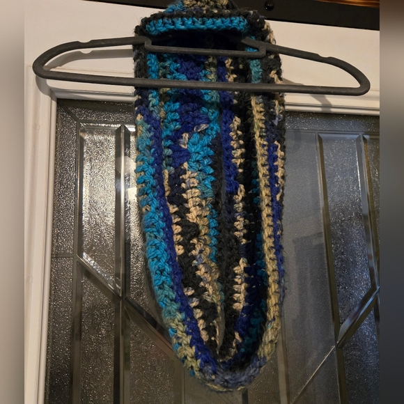 Cozy crochet infinity scarf in blue, black, and cream.