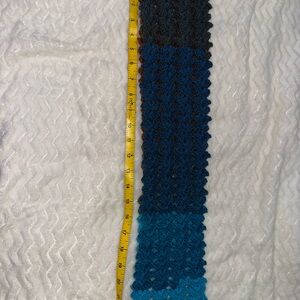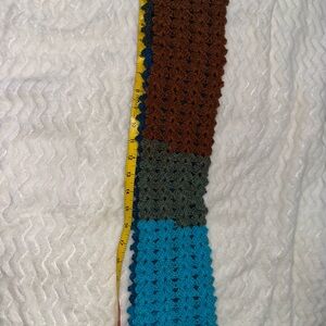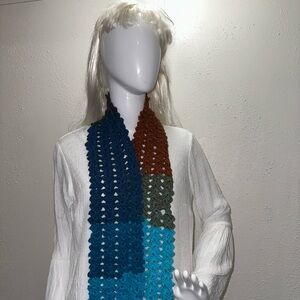Stylish crochet scarf with blue, brown, and green sections. Perfect for adding a pop of color. Please remember this item is handmade, which means each piece is one-of- a- kind and may have small