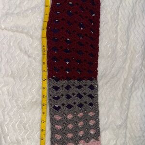 Add a pop of color to your outfit with this stylish crochet scarf. Featuring shades of purple, pink, and gray, it's perfect for any occasion.