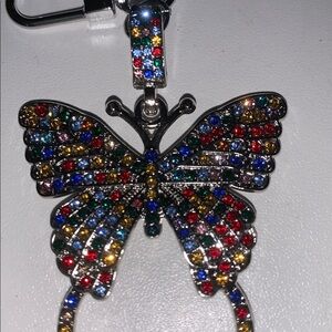 Silver butterfly purse/bag charm keychain adorned with multicolor crystals. Vibrant red, blue, green, and yellow stones create sparkling detail. Secure lobster clasp for easy attachment. Eye-catching accessory to personalize bags or anything you hang it on. Follow my closet for over 100 charms that are all so unique and priced to sell. Thanks