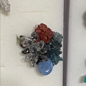 This stunning ring features a vibrant cluster of crystals in red, blue, and silver tones. Perfect for adding a touch of elegance to any outfit.