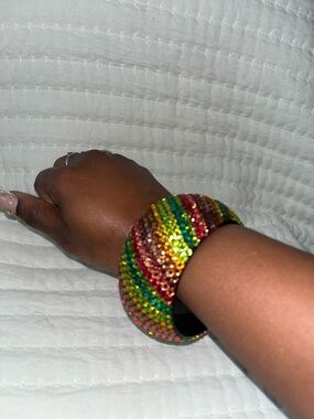Bold bangle covered in multicolored rhinestones. Features diagonal striped pattern in vibrant hues. Statement piece that adds sparkle to any outfit.