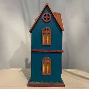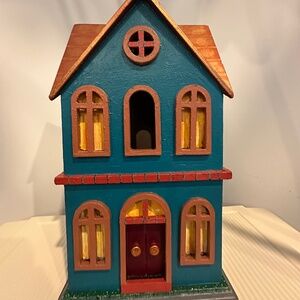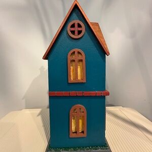 Charming and colorful birdhouse decor piece that adds a fun, rustic touch to any space! Features a bronze-tone roof, multicolored body (Blue green dark red and yellow), and a window-like lighting accent that gives it a warm, inviting glow.