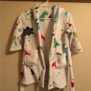 Multicolor Dinosaur Kids Robe. Cozy robe with playful dinosaur pattern. Perfect for bedtime. No brand label or fabric content label available.