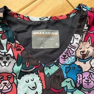 Charming scrub top with a fun dog pattern. Features a blend of red, blue, and black. Sketchers size small, good used condition!
