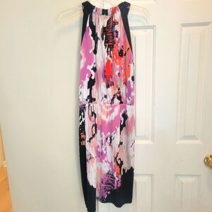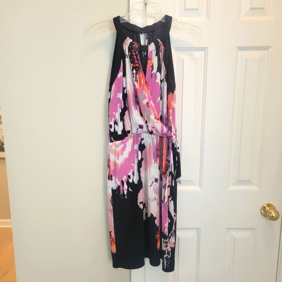 This dress features a vibrant multicolor design, perfect for any occasion. The dress combines shades of pink, purple, and black for a striking look.