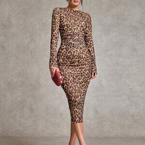 Multicolor Elegant Women's Leopard Print Side Pleated Long Sleeve Dress