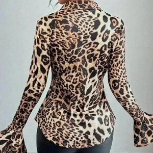 Multicolor Elegant Women's Leopard Print Tight Bell Sleeve Blouse