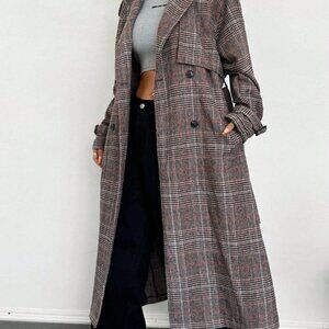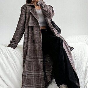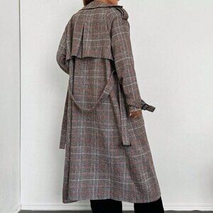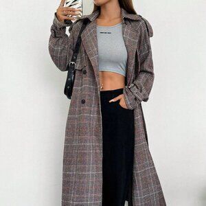 Multicolor Elegant Women's Long Sleeve Open-Front Brown Plaid Woven Trench Coat