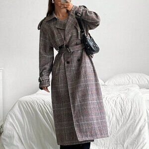 Multicolor Elegant Women's Long Sleeve Open-Front Brown Plaid Woven Trench Coat