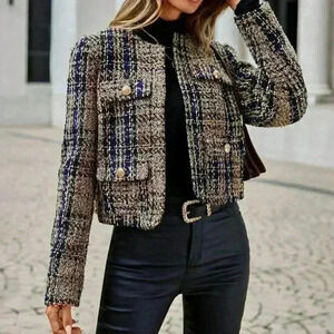 Multicolor Elegant Women's Plaid Pattern Flap Pocket Open Front Tweed Overcoat