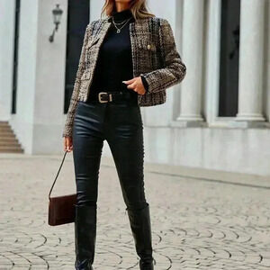Multicolor Elegant Women's Plaid Pattern Flap Pocket Open Front Tweed Overcoat