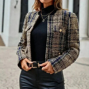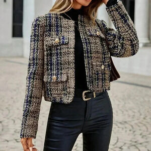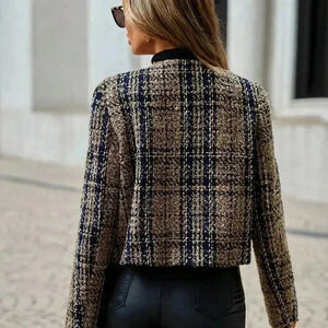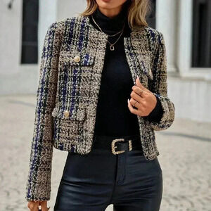 Multicolor Elegant Women's Plaid Pattern Flap Pocket Open Front Tweed Overcoat