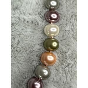Elevate your accessory collection with this beautiful multicolor faux pearl necklace featuring oversized baroque-style beads in soft metallic hues of lavender, gold, silver, cream, and peach. The necklace is finished with a sparkling rhinestone-studded silver-tone heart-shaped toggle clasp, adding a charming detail. This statement piece is perfect for dressing up casual outfits or complementing elegant eveningwear.