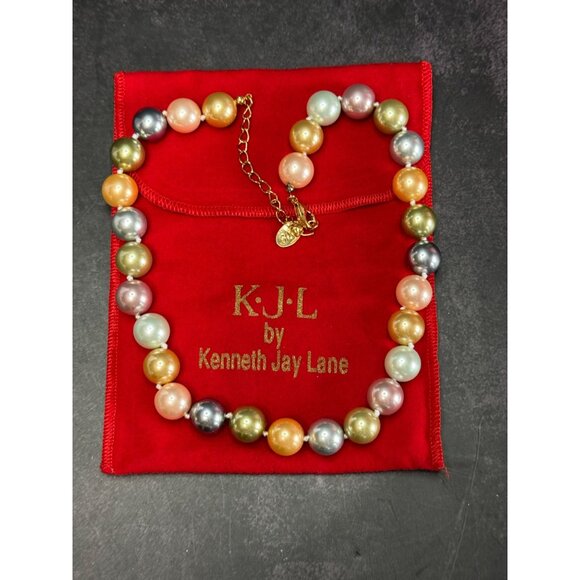 This elegant multicolor faux pearl necklace by Kenneth Jay Lane offers a sophisticated touch to any ensemble. The gold chain and clasp ensure a secure fit. Beautiful pastel and metallic colored beads that are hand knotted into a stunning statement necklace