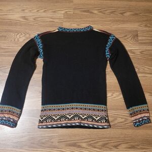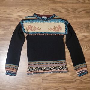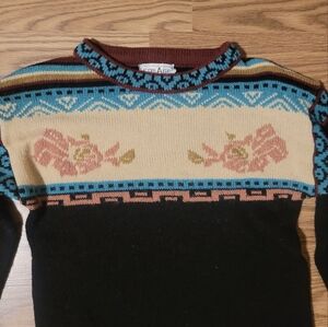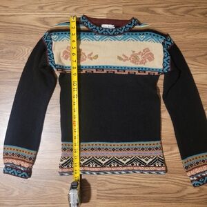 Quirky vintage sweater with intricate multicolor patterns, a cool mix of geometric and floral designs. No size listed, but I am estimating it to be a small. Please check measurements before purchase.