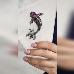 Elegant fish brooch with sparkling multicolor stones. Perfect accessory for any outfit.