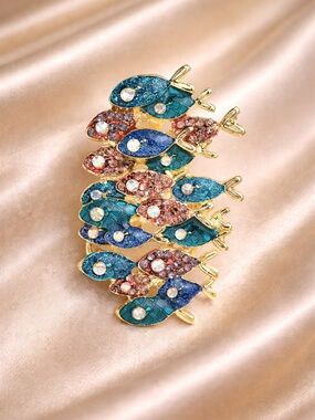 Gold-tone brooch shaped as a school of fish. Multicolor enamel and crystal accents. Sparkling teal, blue, and burgundy tones. Secure pin back for wear. Eye-catching and playful accessory.
