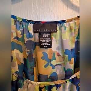 Chiffon blouse with vibrant floral design. Features blue, yellow, and green hues. Lightweight and stylish.