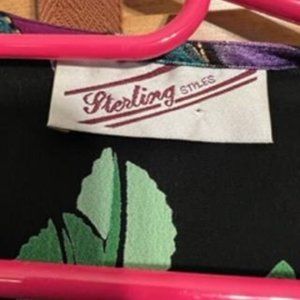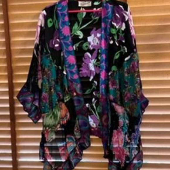 Multicolor floral print (teals, purples, fuchsia, orange and greens) on black background with ruffle fringe. The back length hits on the hip on me (5'3" tall). 100 percent rayon. One size fits most. Lightweight, excellent at concealing upper arms.