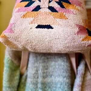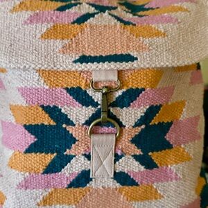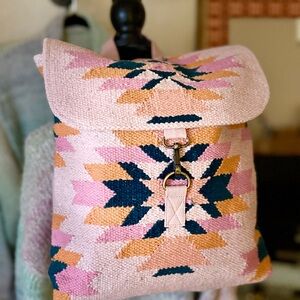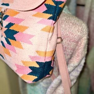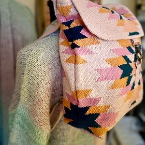 Stylish women's backpack featuring a pink, dark teal, & orange geometric pattern. Aztec inspired.