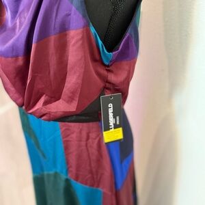 Beautiful and bold Karl Lagerfeld midi dress featuring a striking multi-color geometric patchwork design. Draped neckline, sleeveless cut, and a flattering waist seam give this piece a chic, modern silhouette. Perfect for events, dinners, work, or cocktails. Easy to dress up with heels and jewelry.