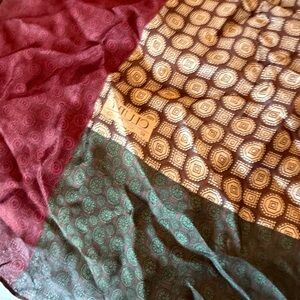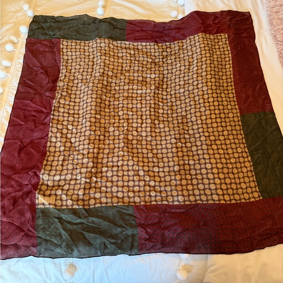 Stylish scarf with a geometric pattern. Features red, green, and tan colors.