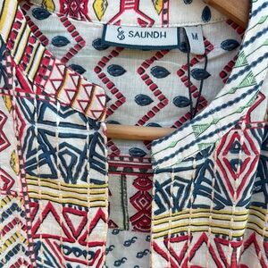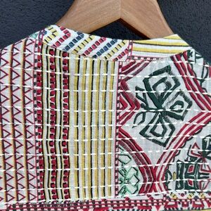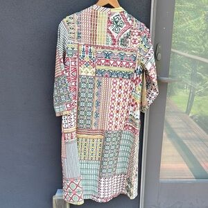 Stylish long Duster with a vibrant geometric design. Features a mix of red, green, yellow, and blue patterns. Ideal for a summer coverup. 100% viscose material, with two side pockets.