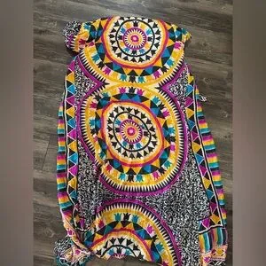 Vibrant multicolor robe (not pajamas) featuring a striking geometric pattern. Perfect for making a bold fashion statement. It does not have a size on it but I believe it to be a small or medium. It’s in overall good shape but I think the previous owner must have washed it because it looks like the colors bled. I added a picture. It never bothered me but wanted to mention to interested buyers.