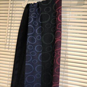 -Beautiful print in stripes and circles pattern. Blue, dark red, pink, black. Fringe ends.