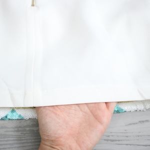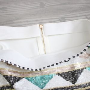 Elastic Waist Detail Back Zipper Closure Sequins on front only Geometric Pattern Fabric has some stretch 100% Polyester Spring, Summer Background color is off white / cream / beige Homecoming Cocktail Formal Wedding Guest Graduation Party Special Occasion Birthday Going Out Bachelorette Date Night Holiday New Year's Eve Vegas Cute Chic Photoshoot Pageant Rehearsal Dinner Casual Prom Sexy Cruise Resort Festival Getaway Vacation Bridesmaid