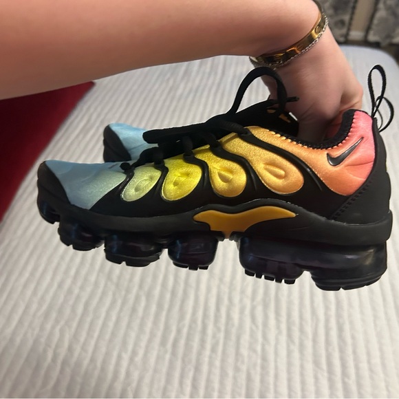 Nike sneakers featuring a striking gradient from blue to yellow to pink. Black accents enhance the design.