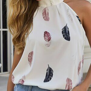 This halter top is perfect for any occasion. It's sexy and stylish, and features a feather print and a keyhole back. The halter top is made of a lightweight fabric that's comfortable to wear and looks great with jeans or dressy pants.