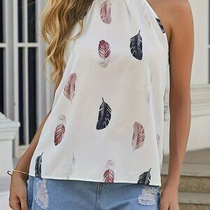 Halter Top with Feather Print and Keyhole Back - Sexy and Stylish Fashion for Any Occasion