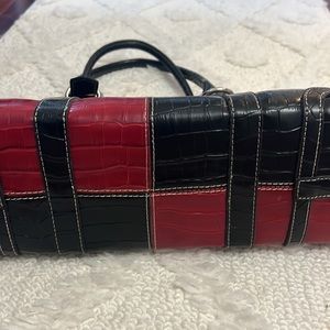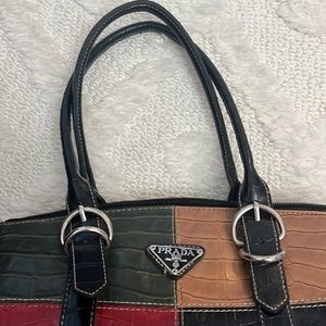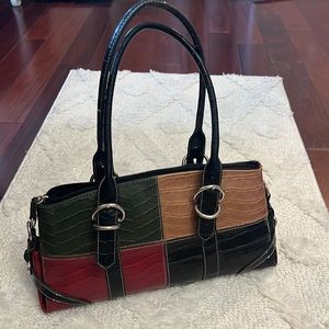 Multicolor handbag with bow alligator. Zipper closure with extra strep. Inside has couple pocket.