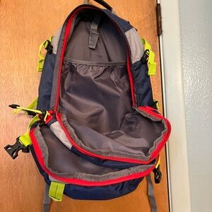 Stylish backpack with vibrant colors. Features red, gray, and blue panels with neon green accents. Has opening for bladder hose.