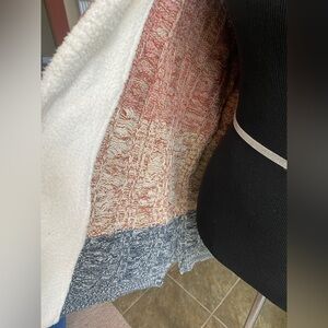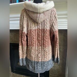 This hooded cardigan is nicely weighted and cozy. Featuring a blend of cream, pink, and gray, it's perfect for layering in style.