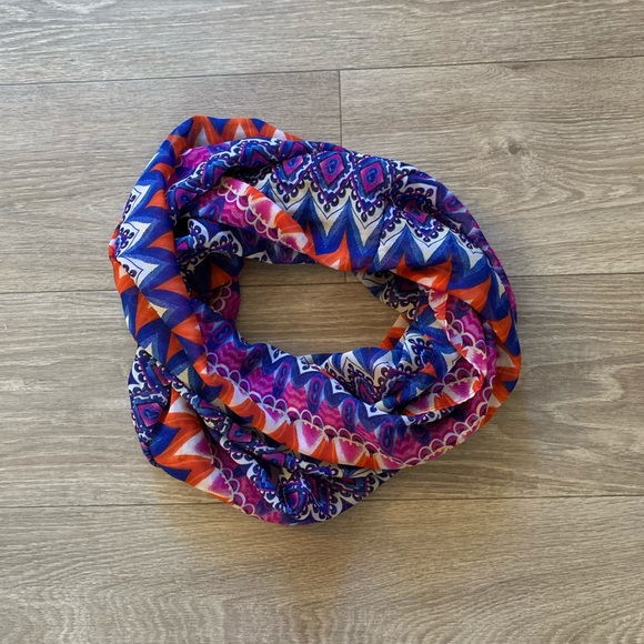 Lightweight multicolor infinity scarf. Unfortunately don’t know the brand since this was a gift. Was never worn but I would recommend machine washing, but laying flat to dry. Price negotiable/offers accepted.