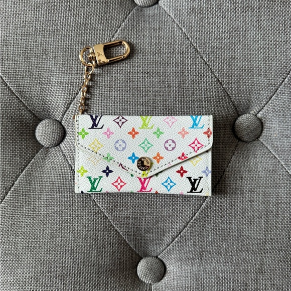 Chic and compact key holder. Features iconic multicolor monogram on white. Gold-tone hardware adds elegance.