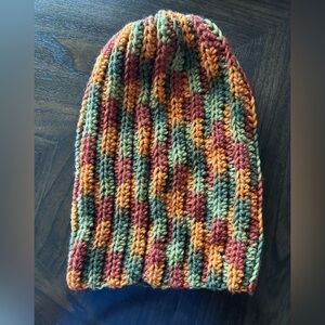 Stay cozy with this stylish homemade multicolor knit beanie. Perfect for adding a pop of color to your outfit.