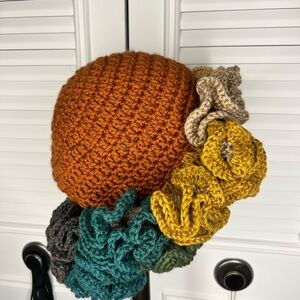 Add a pop of color to your look with this vibrant knit hair accessory. Featuring shades of purple, orange, brown, and teal, it's perfect for any occasion.