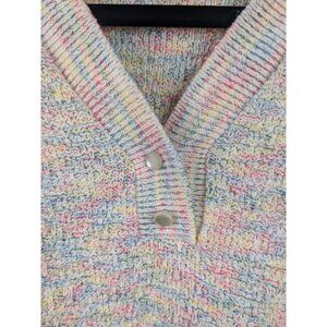 This multicolor knit sweater offers a comfortable relaxed fit in size 1X, crafted from a lightweight cotton-polyester blend for durability. The sweater features a subtle button accent at the neckline and short sleeves for a versatile look. Its quality construction ensures long-lasting wear while the pastel tones offer a fresh, timeless appeal.