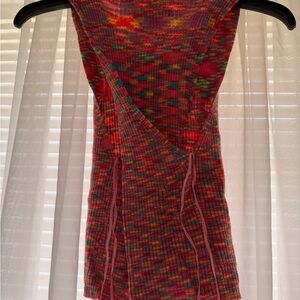 multicolor knit tank in a vibrant red mix. Soft ribbed knit with a fitted silhouette. Bright, colorful pattern perfect for casual or dress-up looks.