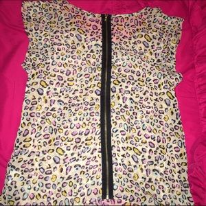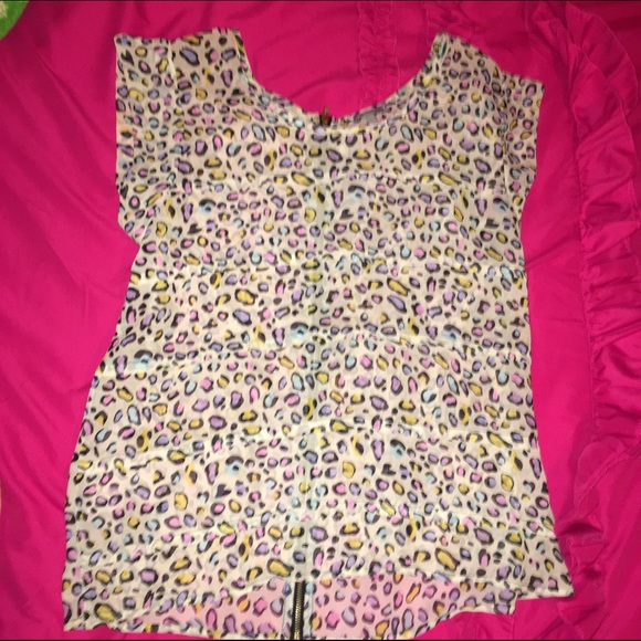 Leopard print top with blue yellow pink dots. In very good condition only worn a few times. Perfect to dress up a casual outfit. It is a bit sheer so you will want to wear a cami underneath.
