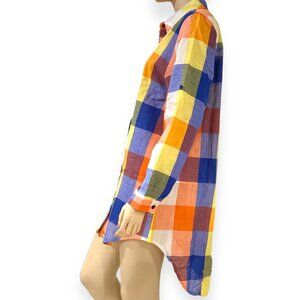 Transform your wardrobe with an amazing multicolor checkered cotton tunic shirt! Great staple as mini dress, lightweight duster jacket, to a long tunic button down shirt. The bold peach, yellow, blue, green, and white large plaid pattern will surely turn heads, roll-up sleeves tabs, long round hemline.