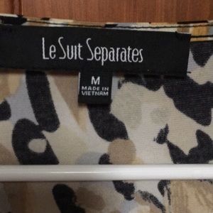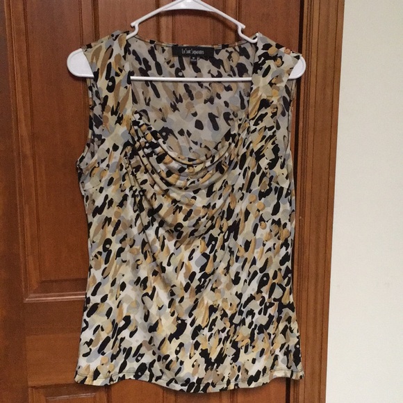 Multi-colored blouse. Draped neck. Looks great with Black, brown or mustard jackets. Tuck or untuck, finished hem.